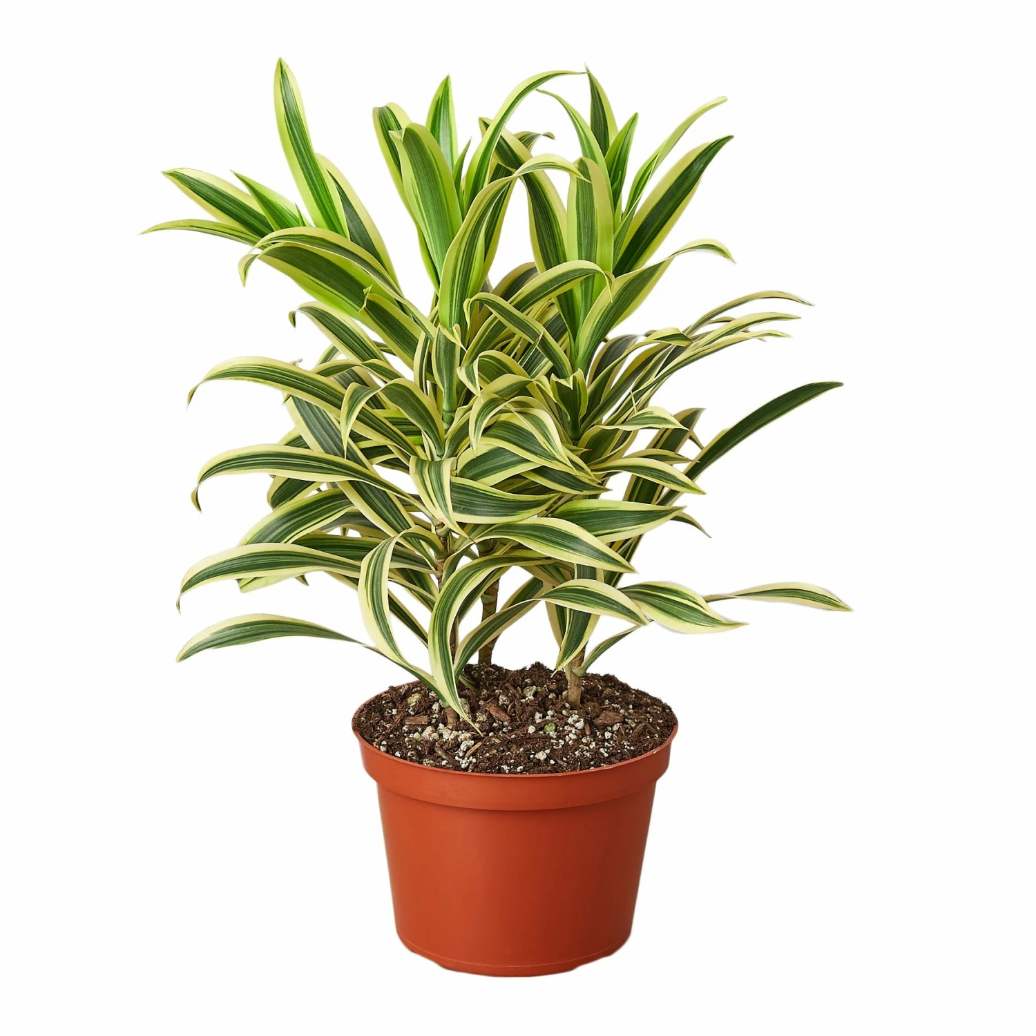 The Dracaena Plant has narrow smooth leaves with a bright yellow color. This hardy plant has yellow and green leaves that make for a great addition to any area. The Song of India in a 4-inch pot is great for larger assortments or areas in your home or office near windows. Most grow strongly upright with long variegated leaves with a large array of colors. Dracaenas grow well at average room temperatures and like ample light.