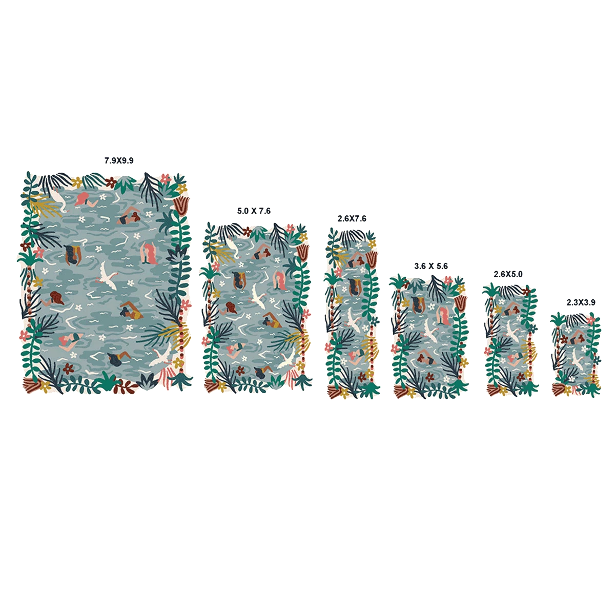 Dive right into our mesmerizing Optimism Ocean rug design and escape to the wild tropics with us! Join these jungalicious ladies doing leisurely laps among egrets and lush planties – all illustrative motifs that are uniquely Justina.