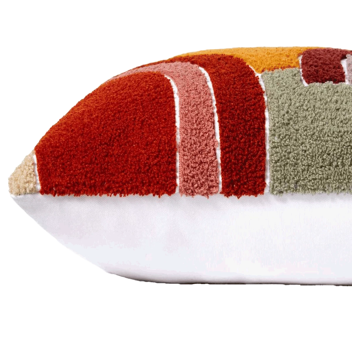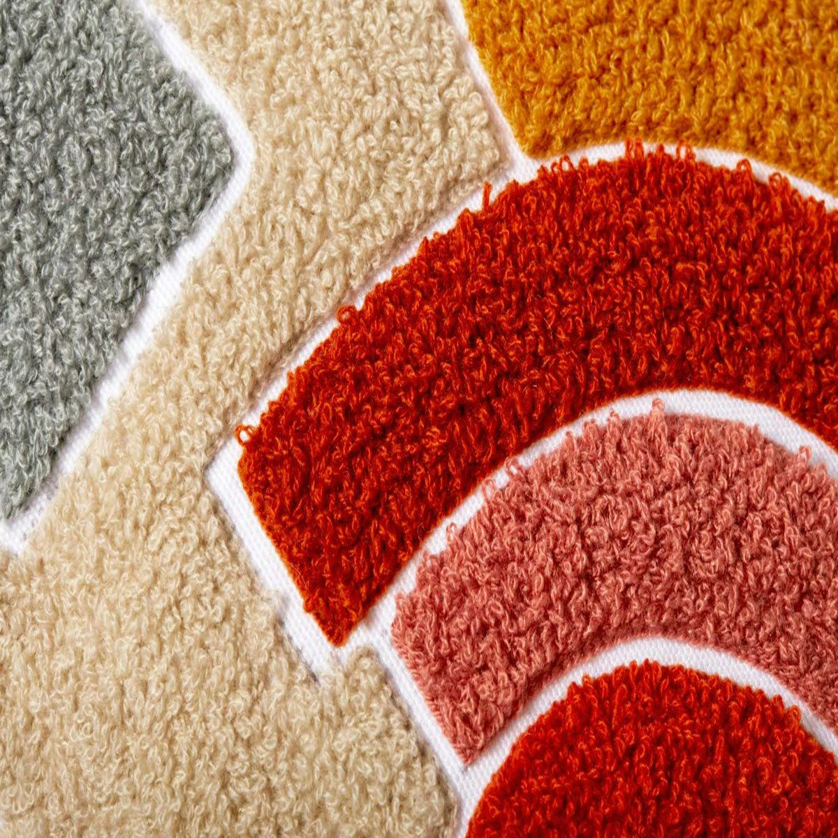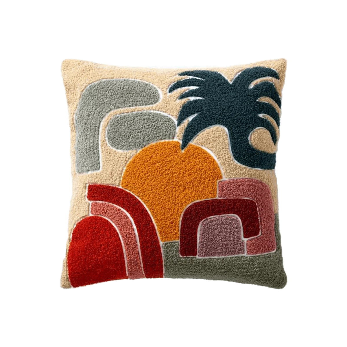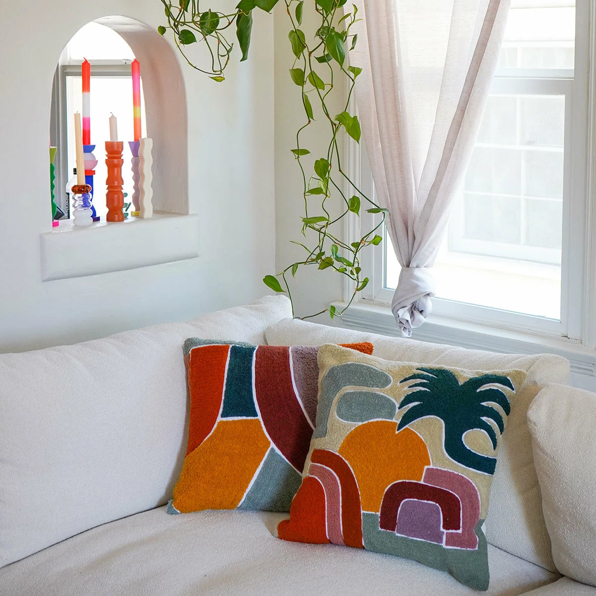 Our best-selling pillow trio is inspired by Justina’s “Isla” painting. Add Reef into your home for a modern take on a relaxed & serene tropical vibe. The whimsical palm tree, sun, and wave shapes in a bold color palette make for one cozy piece of art! We dig the warm, sand-colored ground with hints of sky blue, deep peacock blue, marigold, red, lavender, sage, and salmon.