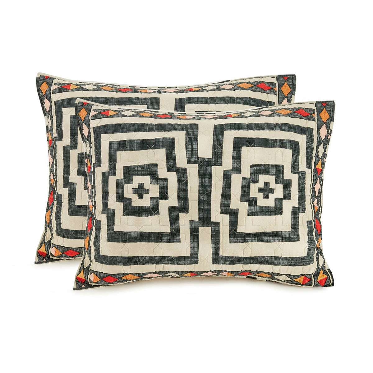 Need shams and no quilt? WE GOT YOU! Our best selling Hypnotic pattern is now available as a standard sham set!The mesmerizing pattern is Justina’s bohotastic take on the classic Greek Key motif. Hypnotic has a creamy base with yummy pops of red, orange and pink while the dark pattern is a shade of charcoal gray.