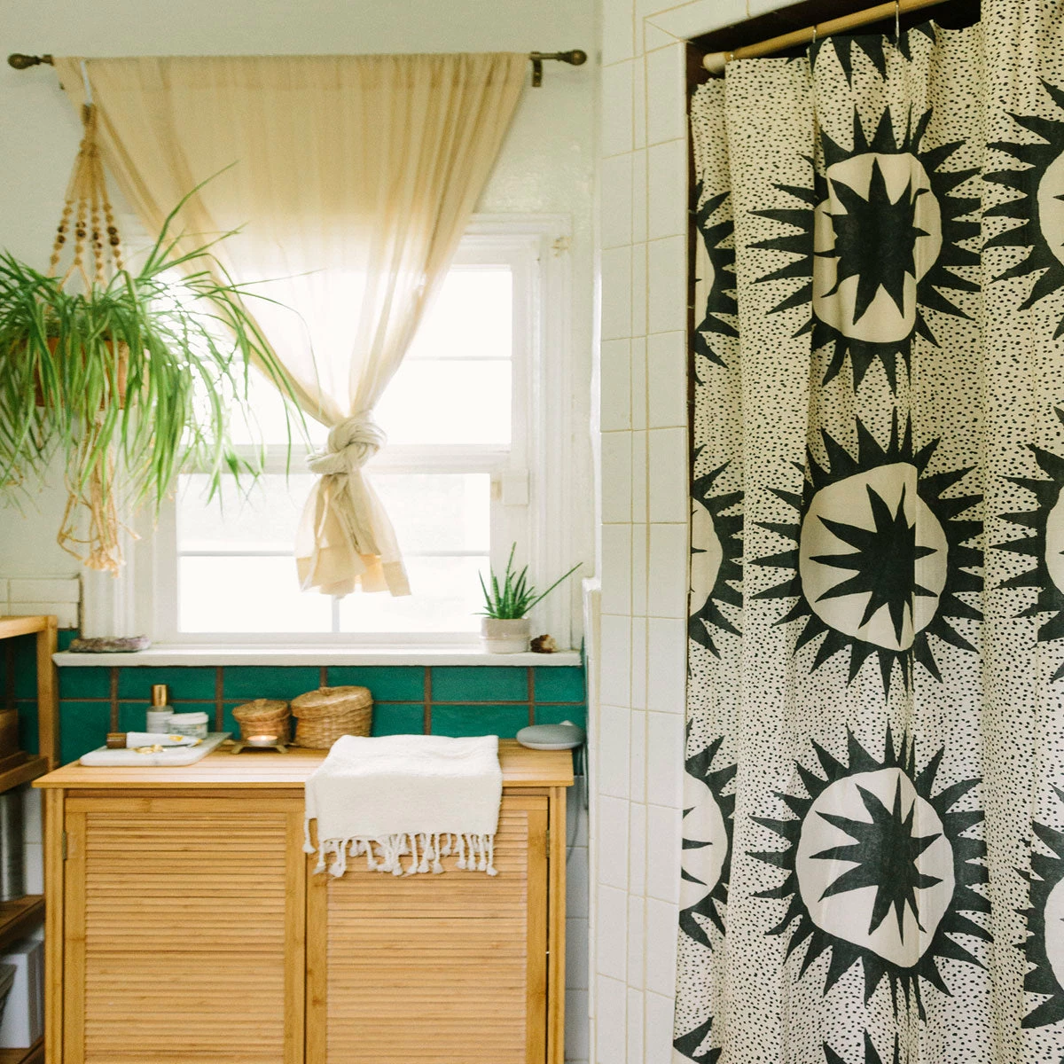 Want to radiate positive energy & good vibes into your home? Our Soleil shower curtain is designed to do just that! The sun-inspired medallion is inspired by traditional Suzani quilt designs. The various dots paired with the suns are meant to symbolize the infinite nature of the cosmos. We think this classic combo of black & ivory would look out of this world in any loo!
